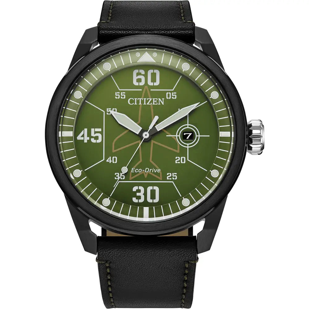 The vintage-inspired Avion Weekender has a timeless appeal combined with modern function. This traditionally styled watch features a black ion-plated stainless-steel case with a green three-hand dial with date display. The rich black leather strap with topstitching and 3-piece buckle closure completes the look. The Avion Weekender also features Citizen's sustainable Eco-Drive technology, powering the watch by any light source, eliminating the need for batteries, and is water resistant to 100 metres.