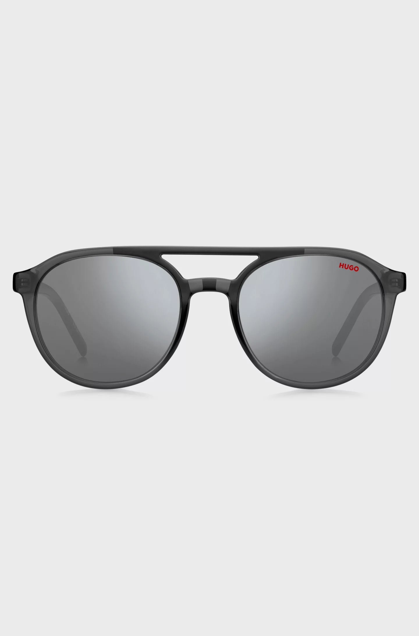 Signature sunglasses by HUGO, featuring patterned and branded temples. This contemporary pair is crafted in grey acetate with a transparent effect.