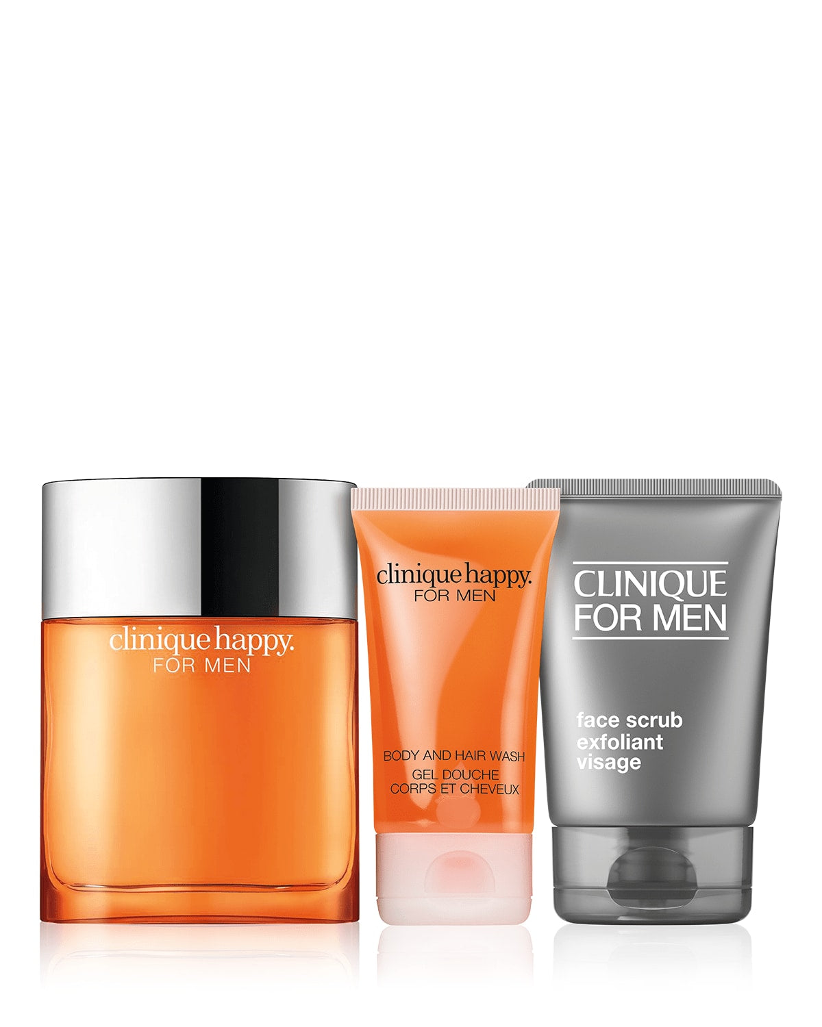 A fresh men's fragrance and grooming 3-piece gift set, including a full-size Happy™ For Men Cologne Spray and Clinique For Men™ Face Scrub, plus a travel-size body and hair wash in the matching scent.