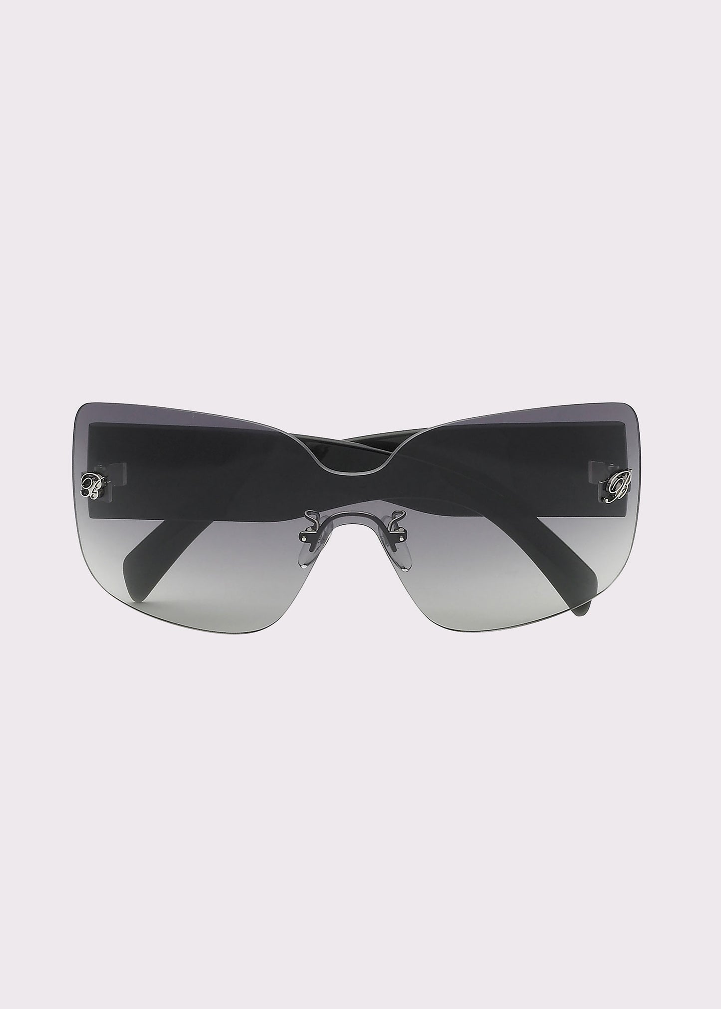 RIMLESS, SLIGHTLY WRAPAROUND MASK SUNGLASSES WITH OVERSIZED FRONT PIECE, IN A ROMANTIC, GLAMOROUS SHAPE. STATEMENT TEMPLES WITH BLUMARINE LOGO LETTERING IN THE EXTENDED VERSION, AND SOPHISTICATED “B” FOR BLUMARINE MONOGRAM ON THE LENS. AVAILABLE IN THE TRANSPARENT COLOUR VARIANTS PASTEL PINK, CHAMPAGNE, LIGHT BLUE, GREEN AND DARK GREY. STYLE AS FEATURED IN THE SS22 RUNWAY SHOW.