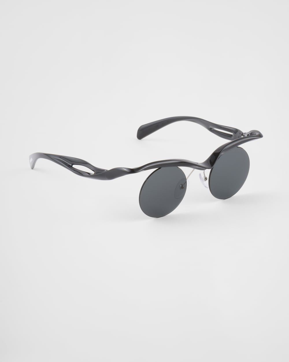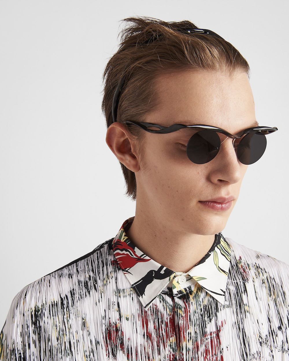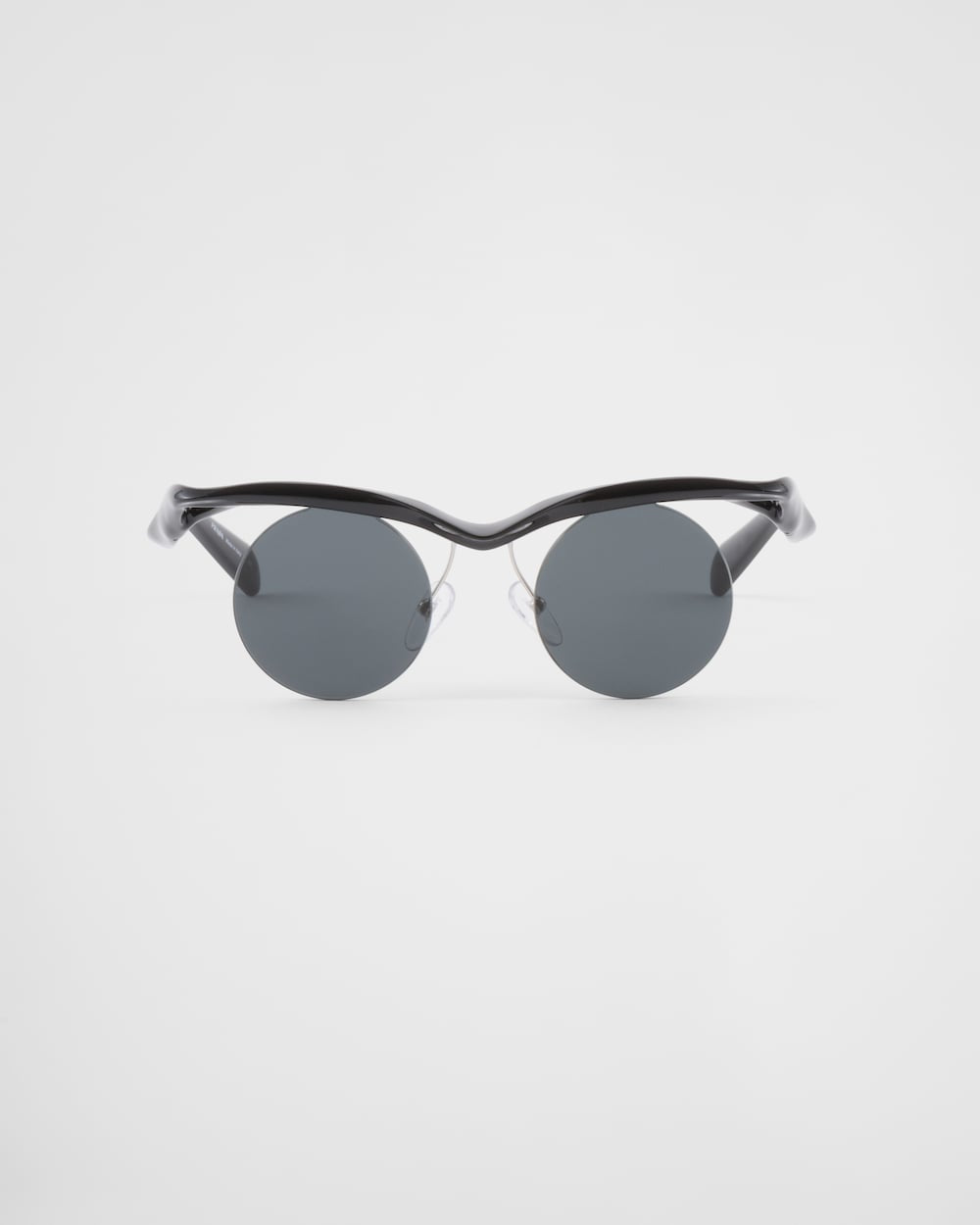 An unconventional and futuristic design defines these runway sunglasses. The ultra-light semi-rimless frame features soft curves and openings combined with the flat, round lenses. The fluid design of the temples is decorated on the temple tip with the Prada lettering logo.