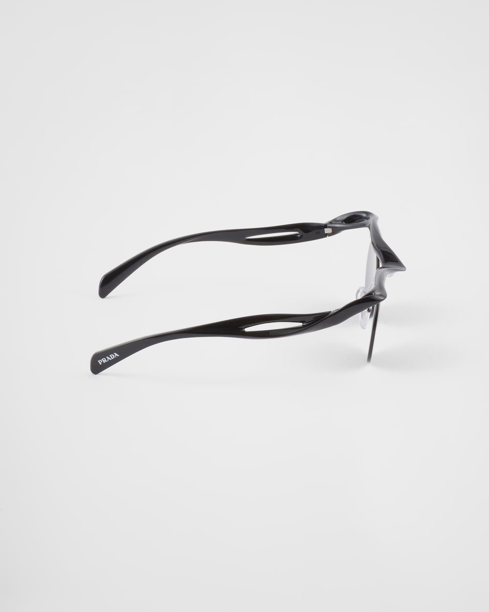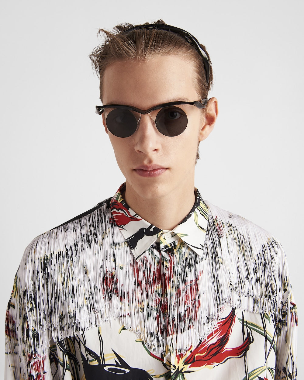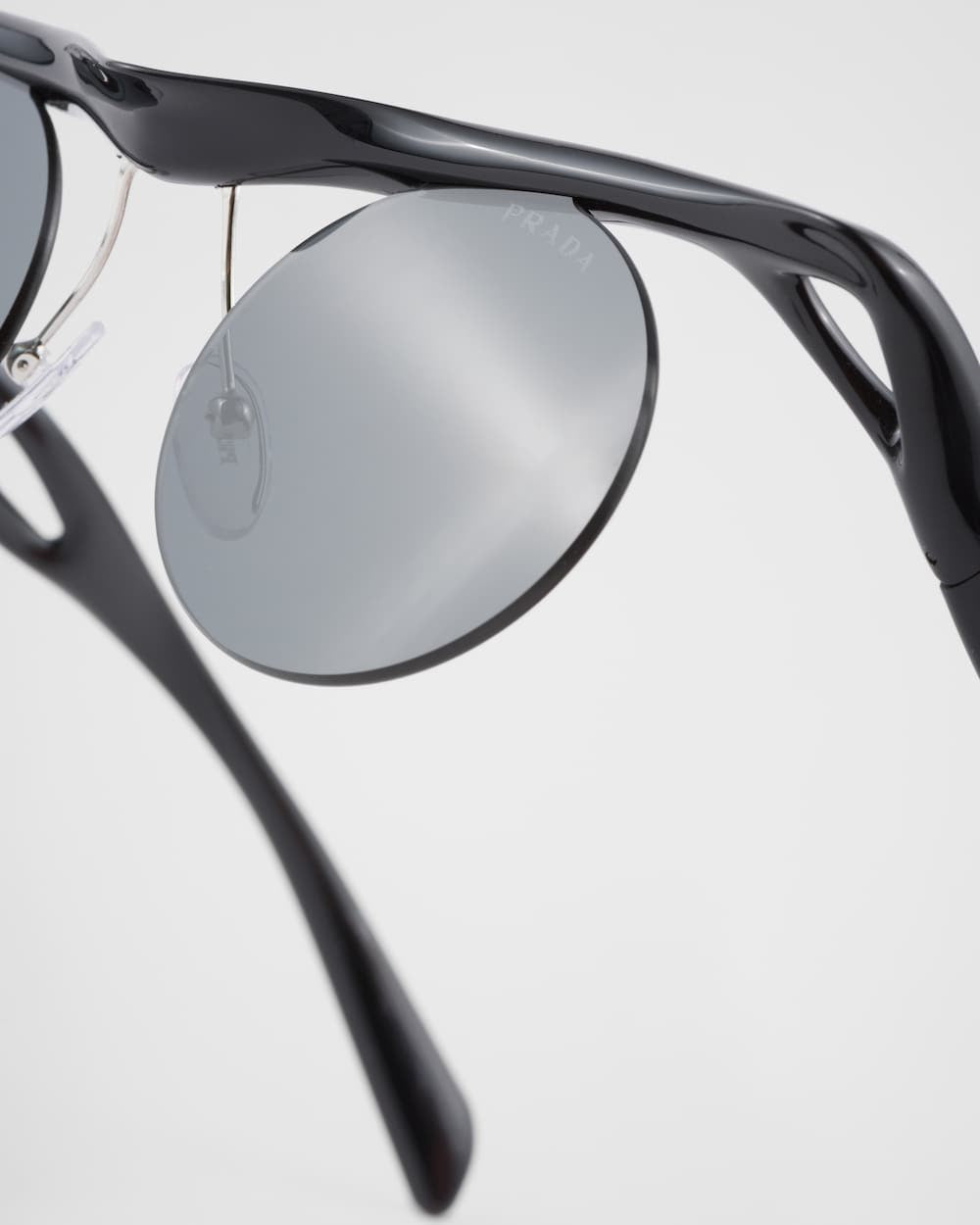 An unconventional and futuristic design defines these runway sunglasses. The ultra-light semi-rimless frame features soft curves and openings combined with the flat, round lenses. The fluid design of the temples is decorated on the temple tip with the Prada lettering logo.