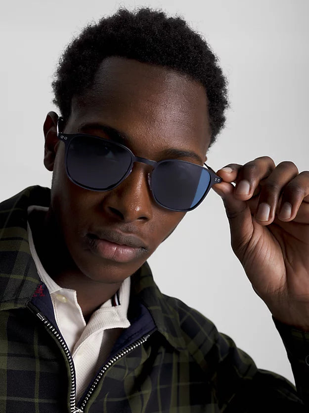 These lightweight stainless steel sunglasses feature square lenses with rounded edges and metal rivets on the front.