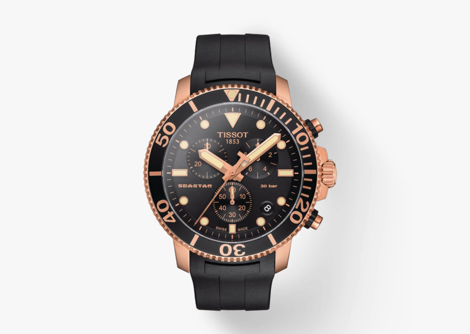The Tissot Seastar 1000 merges style and performance without compromising either. The diving inspiration shapes both the appearance and the functionality of this watch. It maintains its performance to a pressure of 30 bar (300m/1'000ft), combining underwater sports and a preference for a sophisticated Swiss timepiece. The diving theme continues through elements such as a unidirectional bezel, a strap with a divers' safety buckle, plus luminescent hands and markings. Discover this version with its black dial and matching bezel, its black rubber strap and striking rose-gold PVD case.